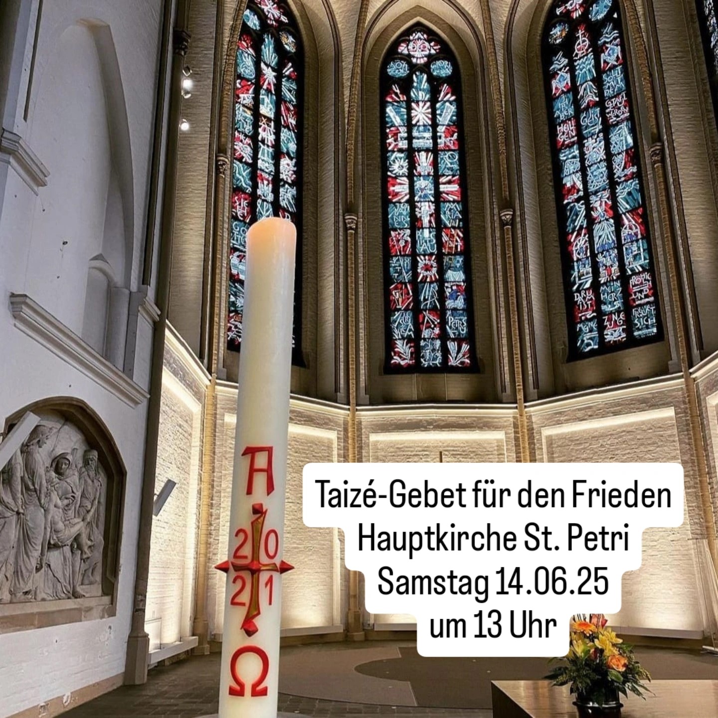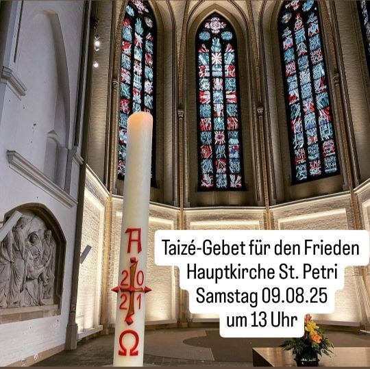 Das monatliche Taizé-Gebet in der Hauptkirche St. Petri am Hamburger Rathausmarkt findet am 14. Juni 2025 um 13 Uhr statt. Wenn ihr mit vorbereiten wollt, kommt einfach um 12 Uhr in die Sakristei. Wir freuen uns auf Euch!